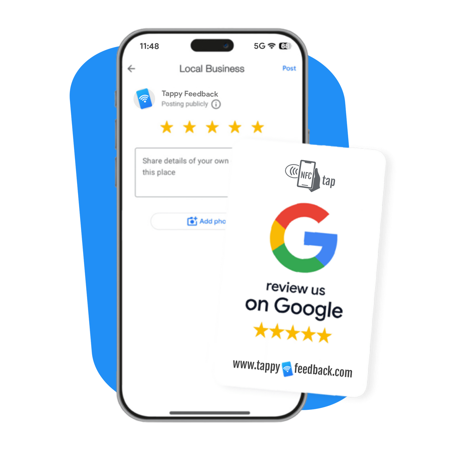 Increase customer reviews by sending them straight to your business review pages with a simple tap ᯤ or scan.